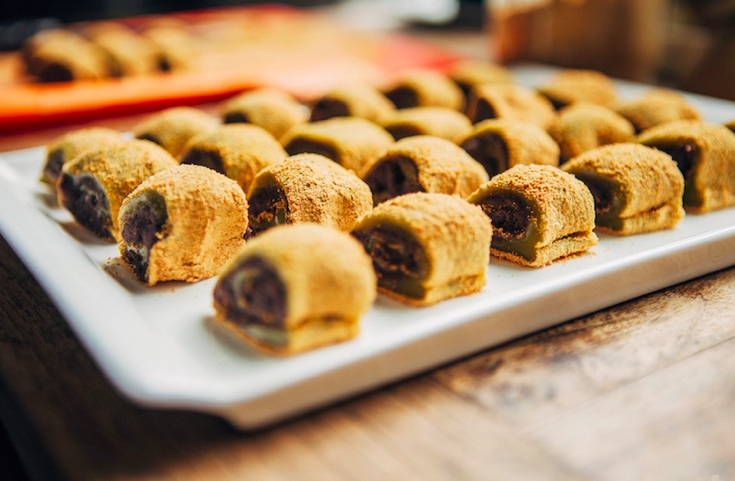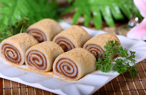 Donkey rolling is one of the traditional snacks in northeast China, old Beijing and tianjin. Due to its final production process on the sprinkle of soybean flour, like the old Beijing outskirts of the wild donkey when raising the loess, hence the name “donkey rolling.” Rolling donkey is made from millet flour or sticky rice stuffed with red bean paste. And then the formed Lvdagun is trundled in sesames. Lvdagun is characterized by fragrant, glutinous and sweet.